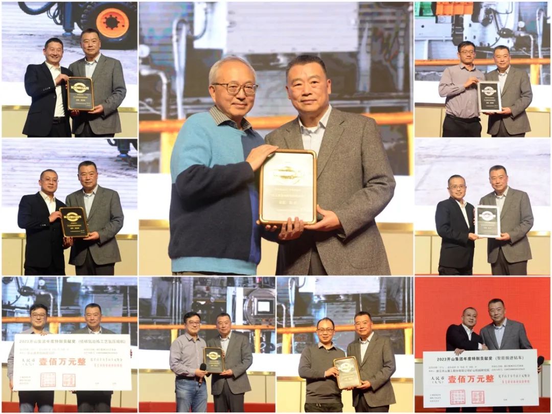 今年年會的重頭戲是首次頒發(fā)的特別貢獻獎。今年的創(chuàng)新特別貢獻獎分別授予了開山重工集團股份有限公司研究院研制的智能掘進鉆車和開山通用機械研究院研制的低碳?xì)湟睙捁に嚉鋲嚎s機,這兩項科研成果在國內(nèi)市場創(chuàng)造了較好的經(jīng)濟效益和社會效益。集團委托上海造幣廠特制的純金獎牌頒發(fā)給了湯炎博士以及夏劍輝、徐雪峰、惠登峰、田兵兵等四位高級工程師;另有純銀獎牌頒發(fā)給了技術(shù)團隊參與兩項創(chuàng)新產(chǎn)品開發(fā)的工程技術(shù)人員。